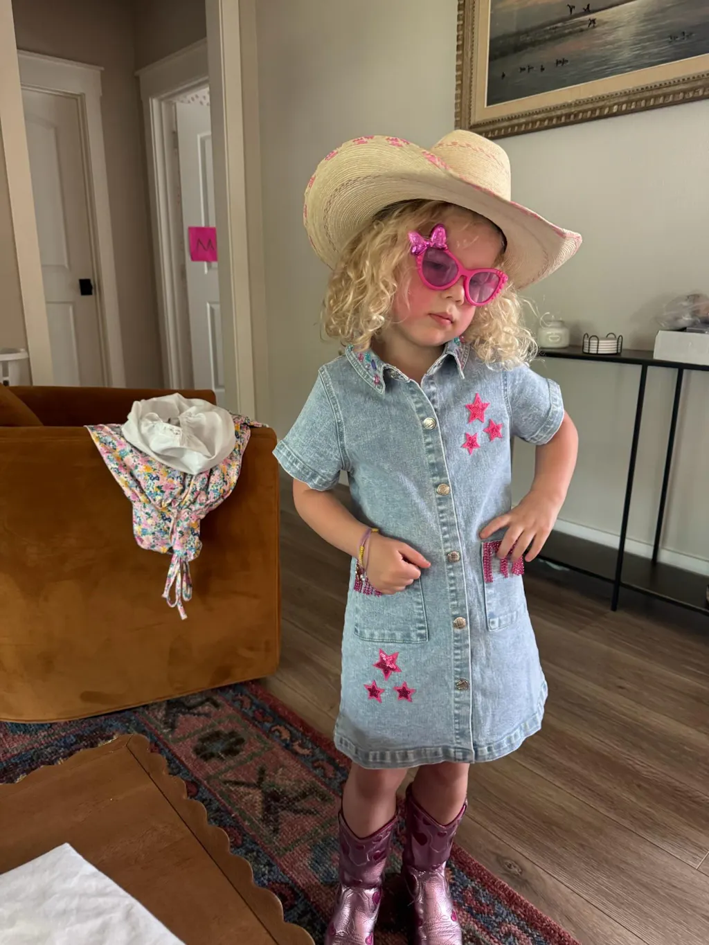 Bold, fun, and full of Wildflower — our Denim Star Fringe Dress is a standout piece. This short-sleeve denim dress features a gem-embellished collar, hot pink star appliqués, and fringe-trim pocket details for a playful western-inspired touch. Made from stretchy denim.