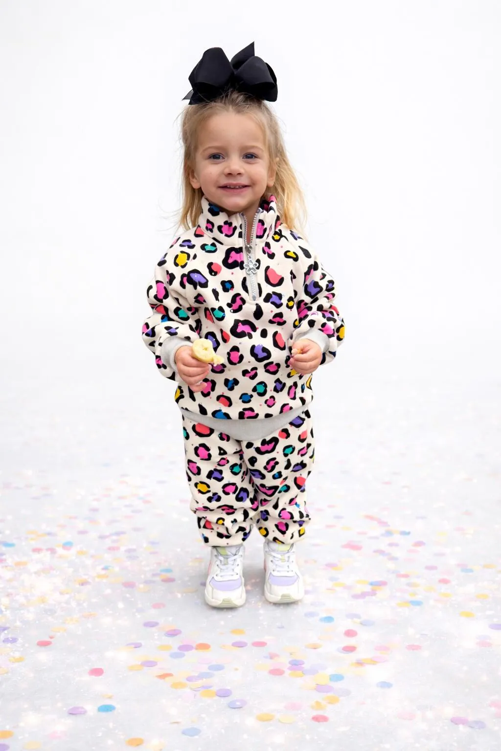 These trendy girls' colorful leopard print joggers are sure to make a statement! The jogger pants feature metallic threading cuffs, adding a touch of sparkle to the ensemble, and rainbow metallic drawstrings. Colorful gem stamping on the pants adds a touch of glamour to this fun and stylish outfit. Perfect for any fashion forward girl who loves to stand out from the crowd.